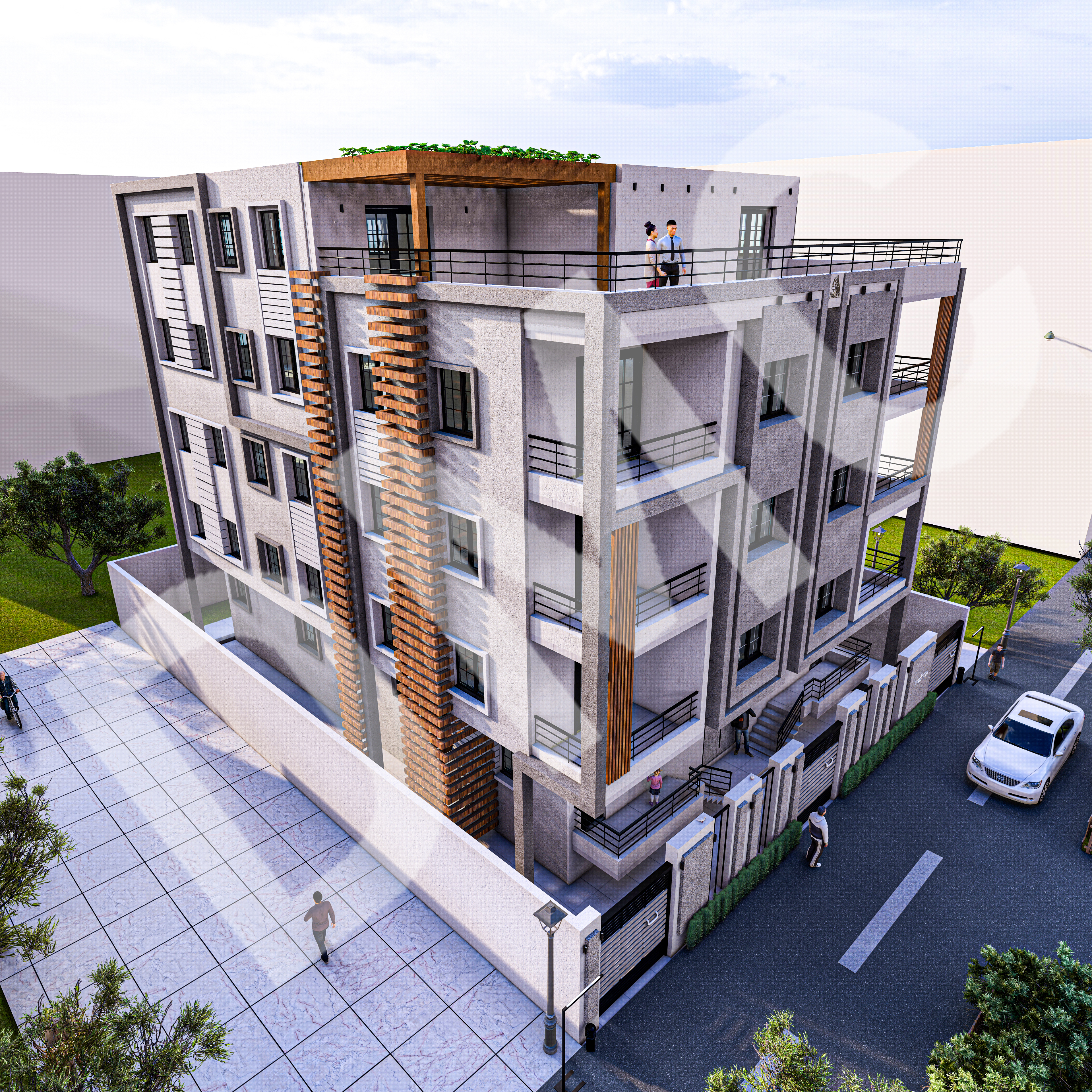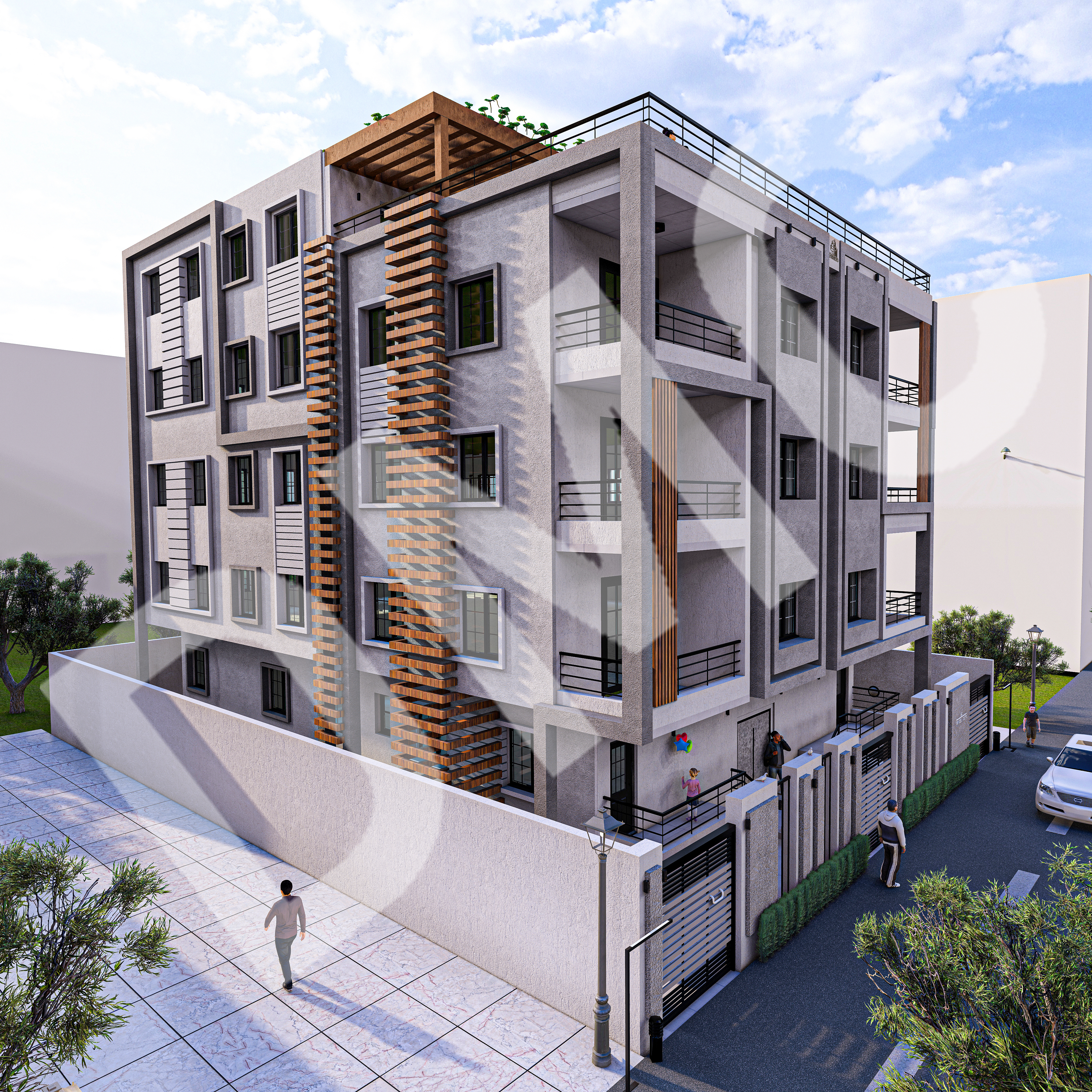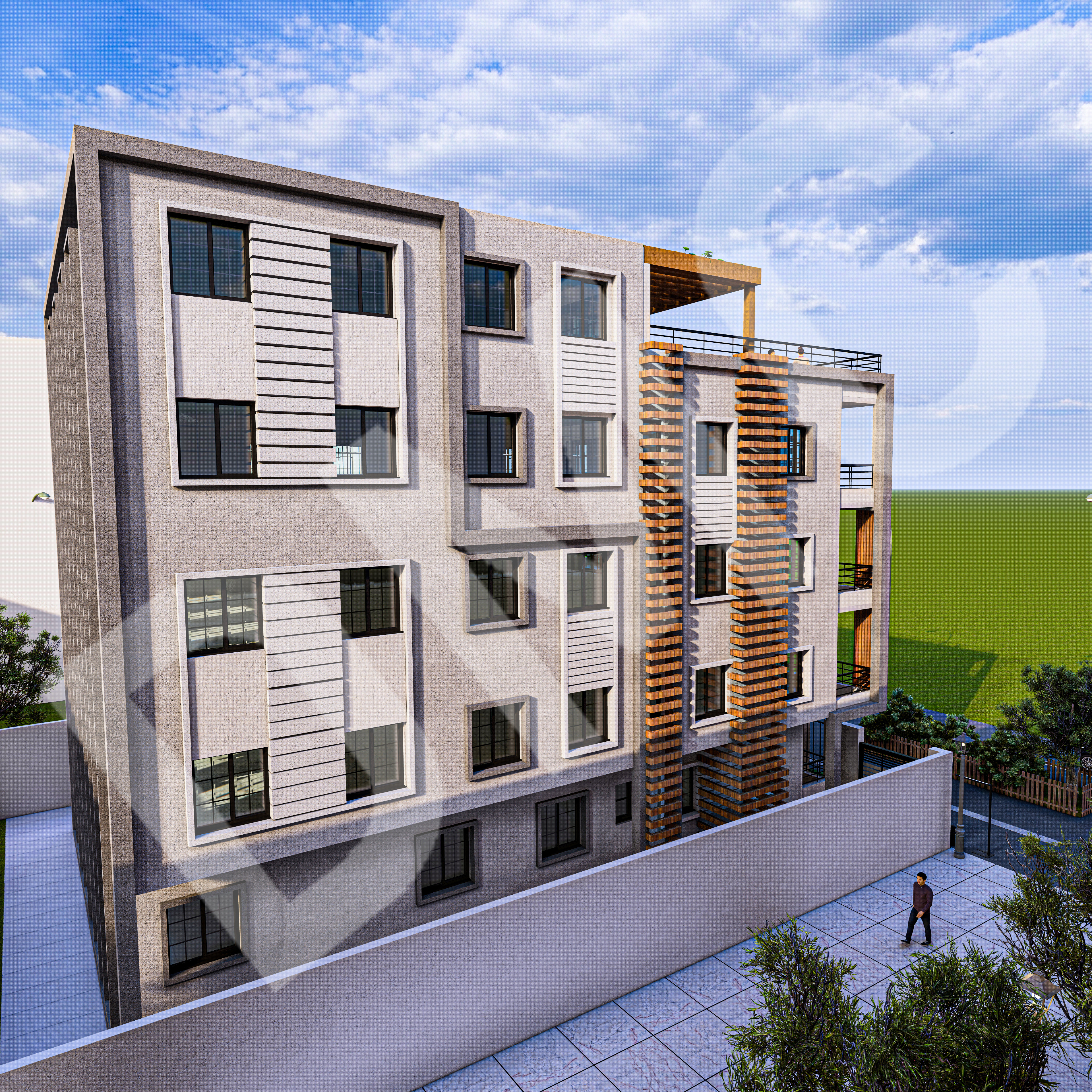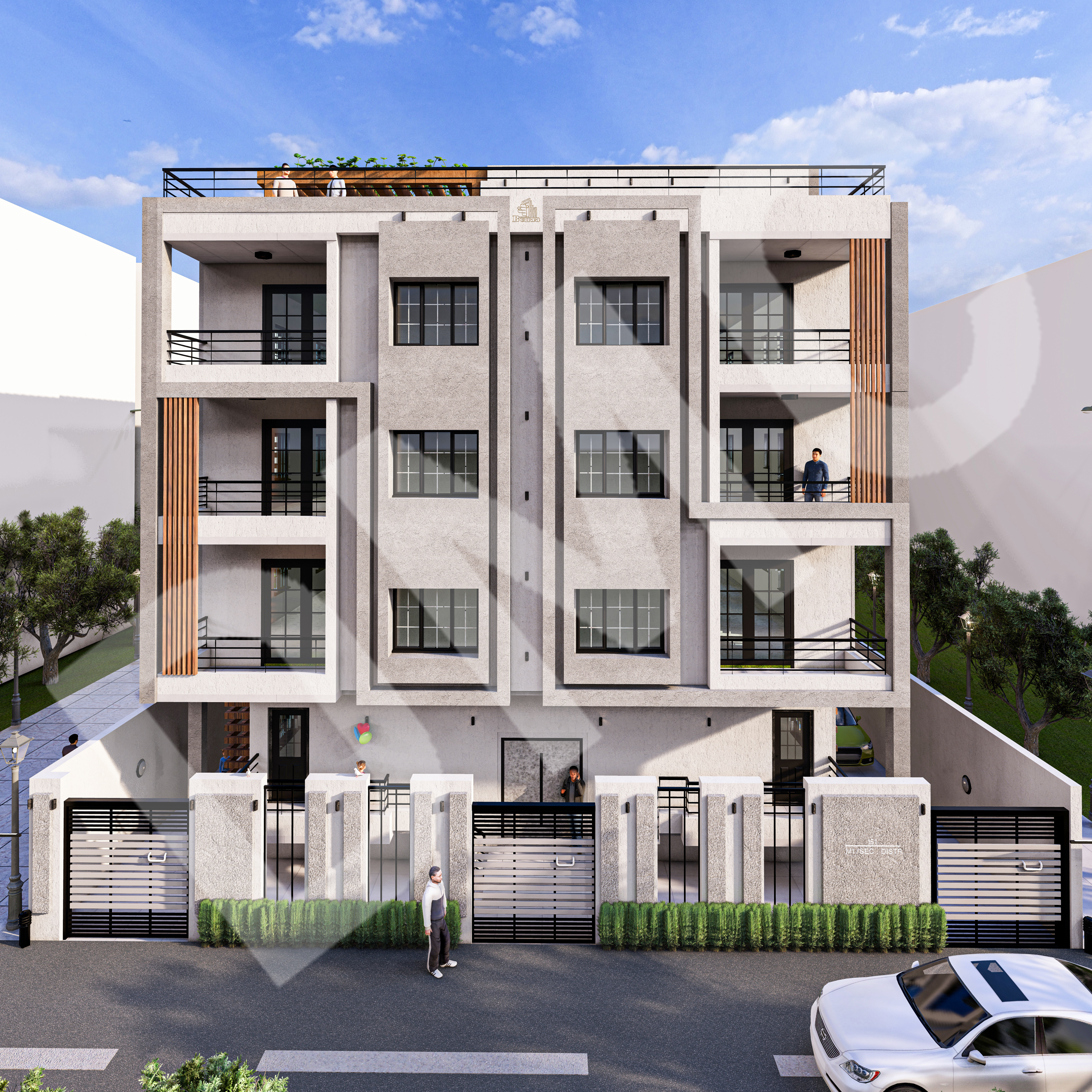 This design merges modern minimalism with timeless elegance—an iconic facade that stands out through its refined gray and white palette, enriched by the warmth of natural wood.